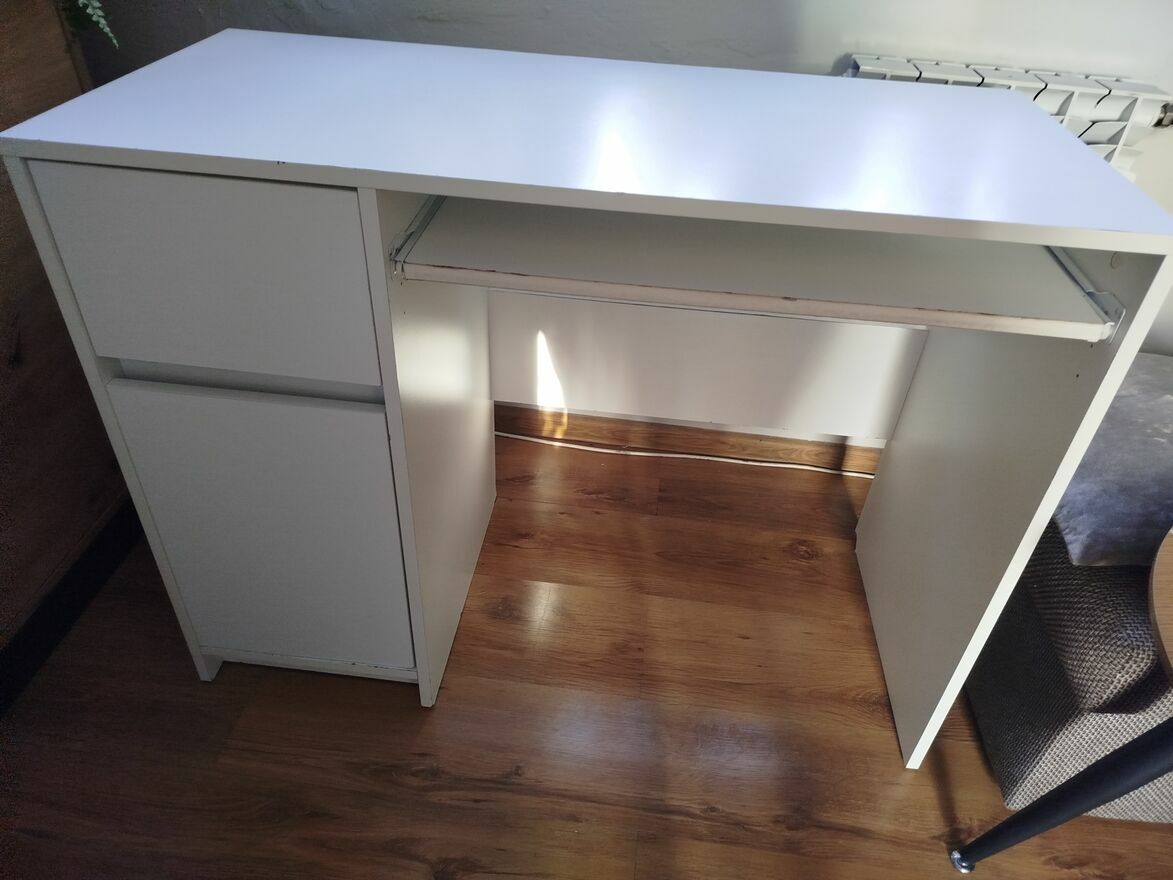 Witam biurko i regał w bardzo dobrym stanie. Wymiary biurka to szerokość 100, wysokość 76, głębokość 45. Wymiary regała szerokość 46, wysokość 94, głębokość 29.5 . Więcej informacji na priv.Pati