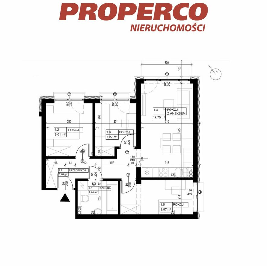 c) 3 sypialnie (pow. 9,01 m2, 7,27 m2, 9,07 m2),