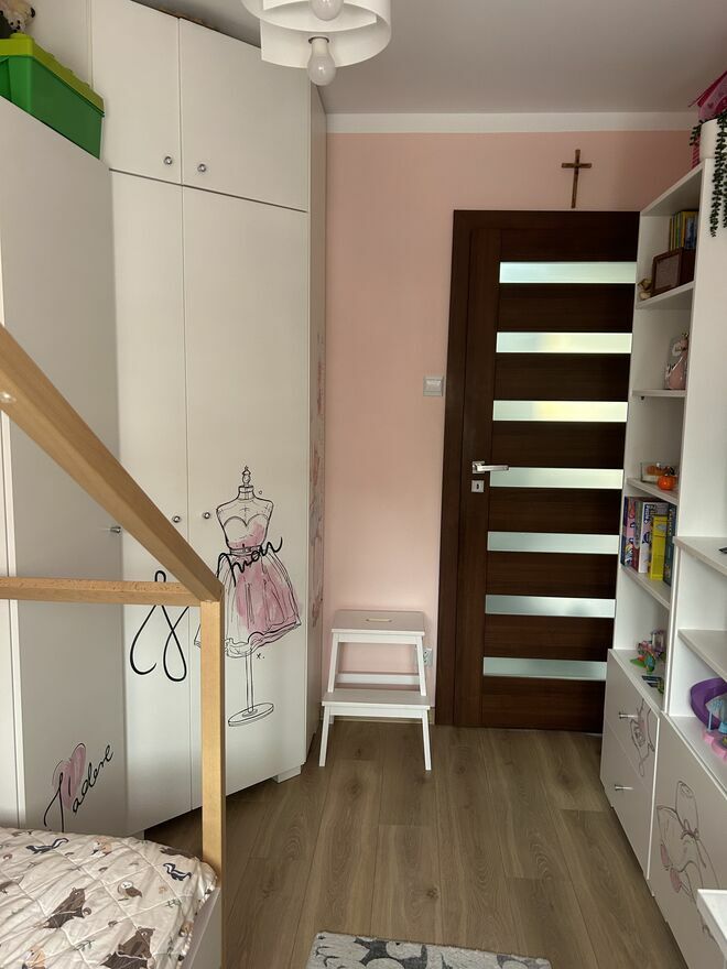 - przedpokój (zasuwana, solidna szafa w zabudowie, pawlacz, szafka na buty)